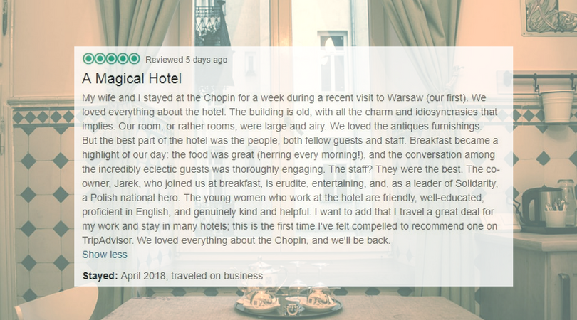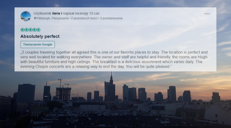 Nasz mały hotel nie tylko jest wymieniony w przewodnikach turystycznych. Niektórzy pisarze, którzy nas odwiedzili, zakochali się w tym miejscu i wiele o nas pisali. Tak jak nasz dobry przyjaciel – znany amerykański pisarz – Rick Steves. Byliśmy prezentowani w kilku liczących się czasopismach, w artykułach opisujących podróże i doświadczenia kulturalne związane z wizytą w Warszawie.